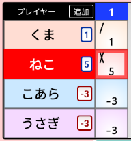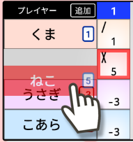 プレイヤーの交代に合わせてキャラクタ横の【次】をタップします。プレイヤーが得点するごとに入力ボタンをタップします。