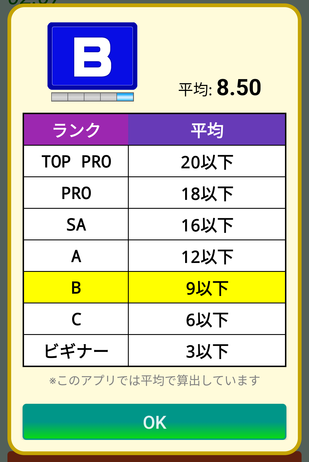 通常10ラックを1ゲームとして、5または10ゲームの合計点でビリヤードスキルを判定します。このアプリでは平均点を使っているのでゲーム数に関係なくスキルを簡易判定することができます。