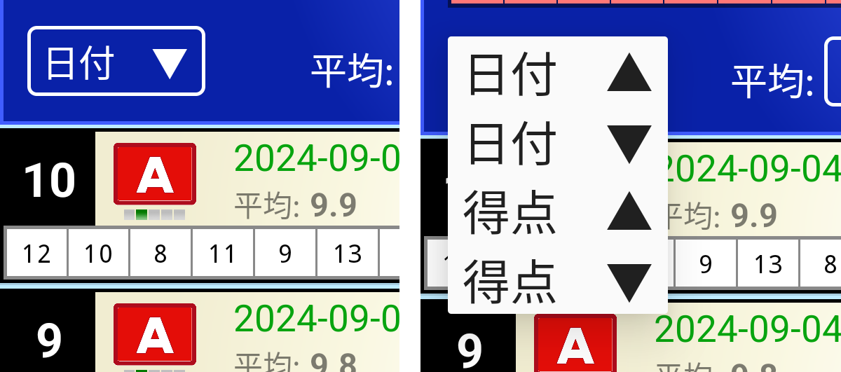 日付順、得点順に並べ替えることができます。